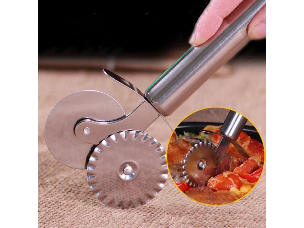 Krájač na pizzu double z nerezovej ocele pre jednoduché a rýchle krájanie pizze na jednotlivé dieliky. Je možné použiť aj na iné druhy pokrmov. Ľahko umývateľný.
